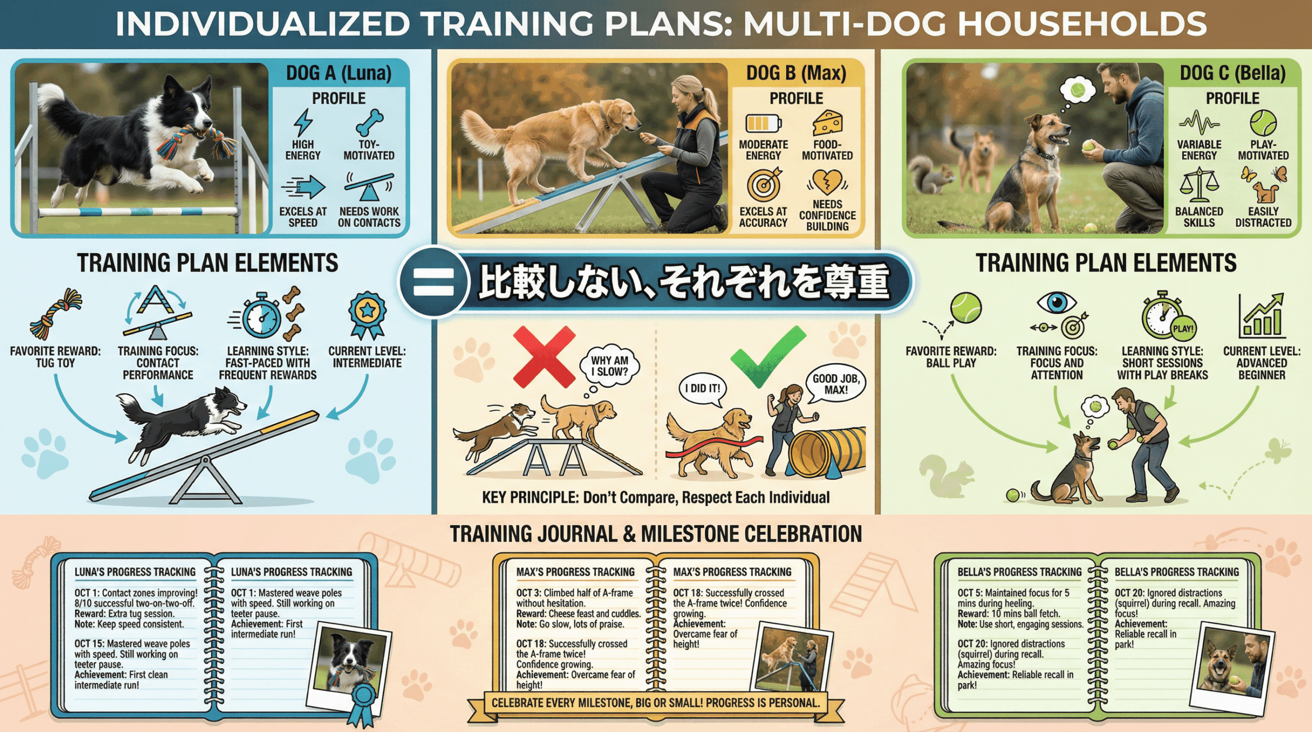 複数の犬と暮らす家庭にとって、アジリティはそれぞれの犬との絆を深める素晴らしい機会です。しかし、2頭、3頭とトレーニングを始めると、喜びと共に特有の難しさも見えてきます。どうすれば効率的に、そして公平にトレーニングできるのか?この記事では、多頭飼いのハンドラーが直面する課題を克服し、すべての犬がハッピーでいられるための3つの重要な戦略を紹介します。