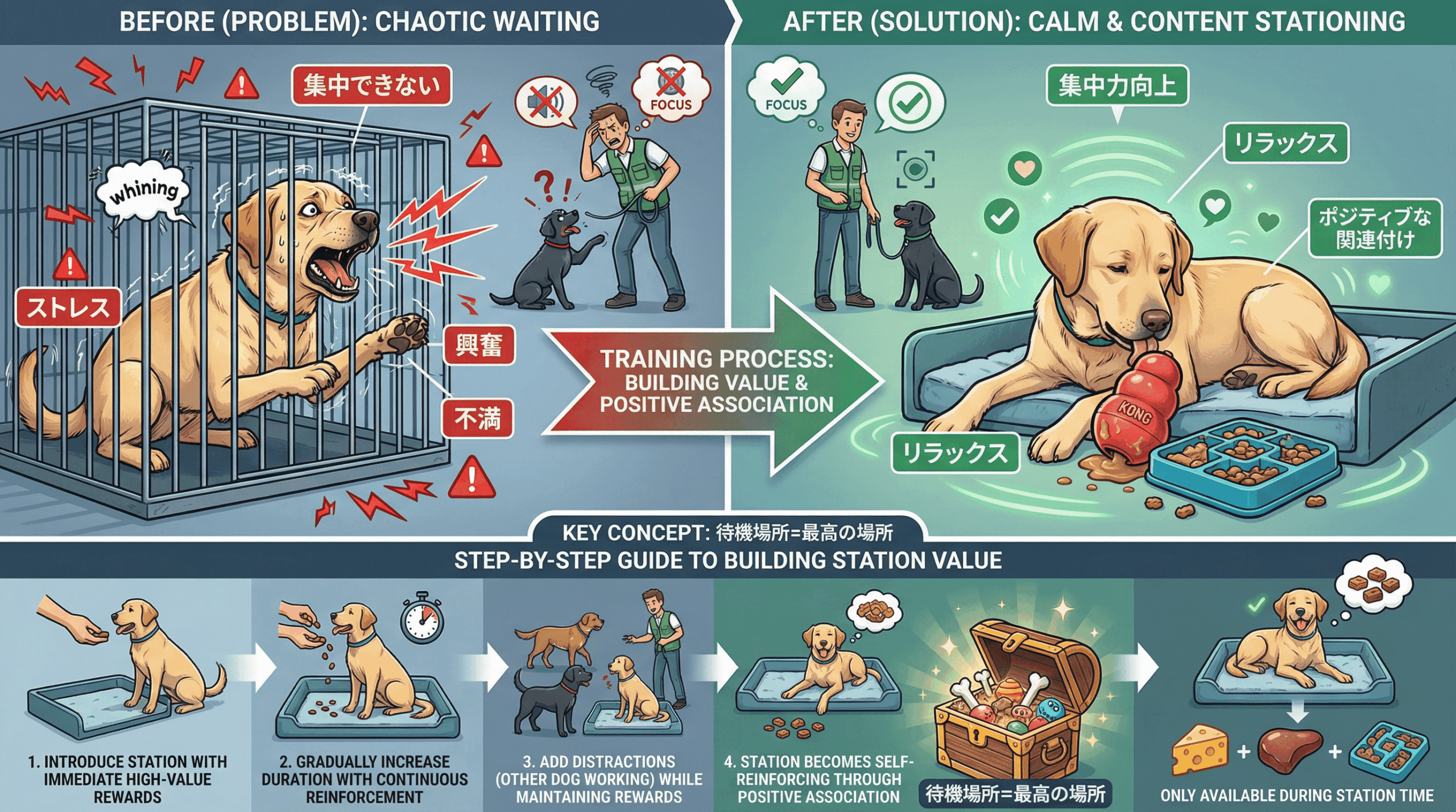 待機場所(クレート、マット、車など)を、「我慢の場所」ではなく「特別なご褒美がもらえる最高の場所」に変えることが重要です。これを「ステーションニング」または「クレートゲーム」と呼びます。普段は与えない、非常に価値の高いおやつ(チーズ、レバーなど)を用意し、それは「他の犬がトレーニング中に、ステーションで静かに待っている時だけ」もらえるようにします。最初は短い時間から始め、静かに待てたらすぐに報酬を与えます。徐々に時間を延ばしていくことで、「待っていれば良いことがある」と犬は学習します。各犬に、これからトレーニングを始めることを示す明確な合図(特定の言葉やジェスチャー)を教えることで、待機中の犬は「今は自分の番ではない」と理解しやすくなります。