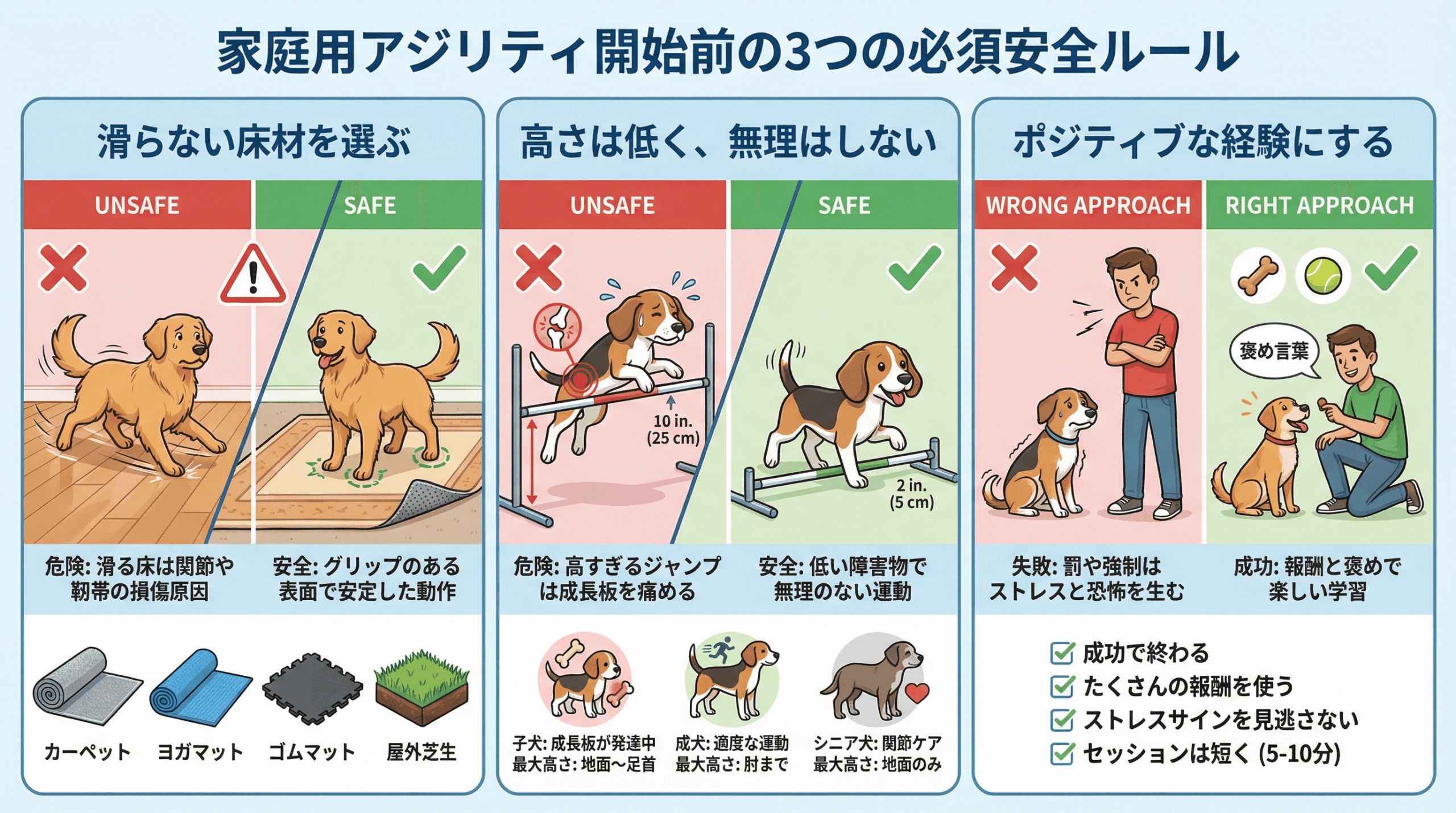 家庭でアジリティを始める前に、最も重要なのは安全性です。以下の3つのルールを必ず守りましょう。