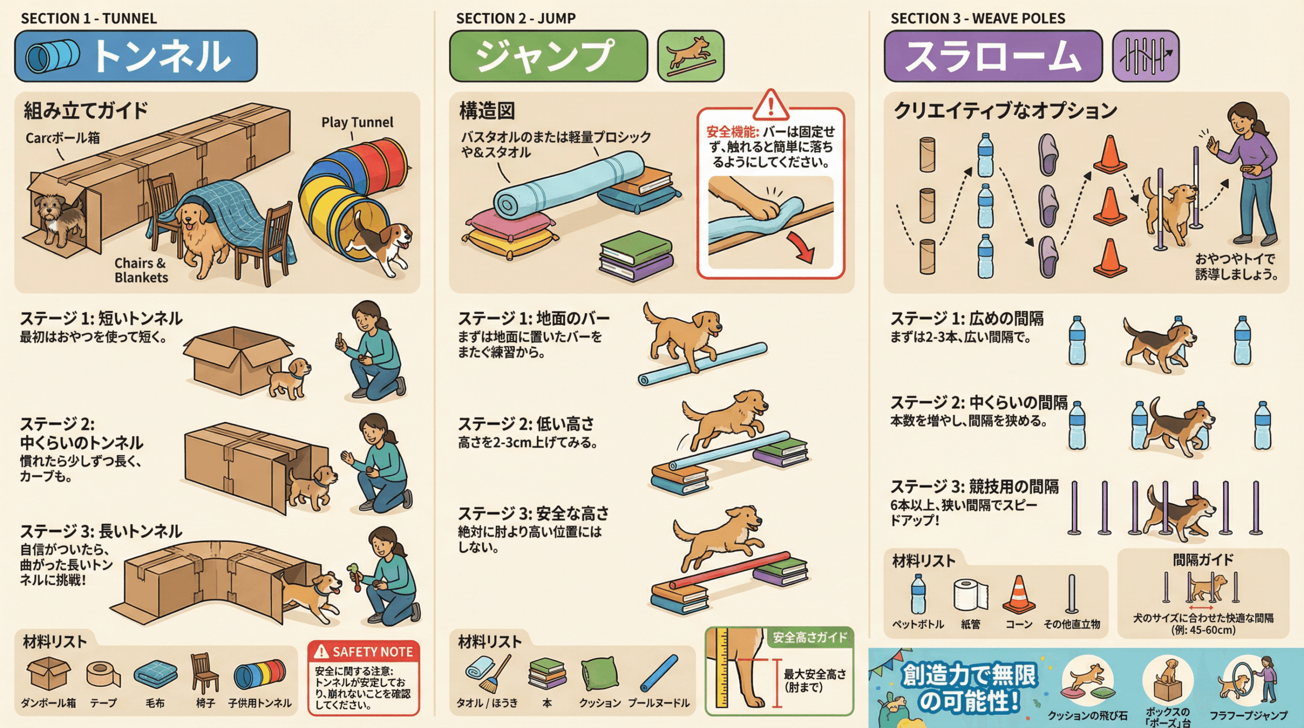身の回りにあるものを使って、簡単にアジリティ障害物を作ることができます。ここでは、3つの代表的な障害物の作り方と遊び方を紹介します。